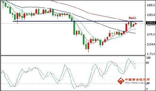 从小时图上面看MACD指标0轴之下金叉向上运行,KD指标目前走势已经出现了滞涨,处在超卖区域震荡,布林带走势多空游离不定,对短期走势形成的参考读不高,目前要重点关注的是日线图形上面60天均线给出在1350一线阻力。