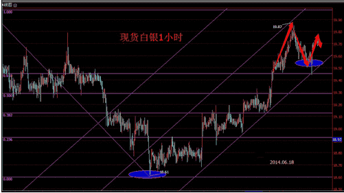 图解:同样是下跌过程中的修复,白银相对于黄金,显得一点都不示弱,尤其是最近两个交易日,白银价格反而比黄金价格强势,大家可以对比发现,国际黄金还在0.618之下挣扎,而国际白银早已居于在0.618之上,上方预计要试探19.80强阻,但逼近上行通道上轨,白银处于高位,同样有做双头的嫌疑,对于白银的大幅下挫,我们同样需要提防。