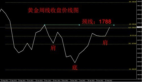 技术图形上,周线收盘价线图所示,金价探底1522之后,正走构筑一个大型的头肩底,而头肩底形成的确认条件是,突破上方的颈线位置1788!巧合的是,1920-1522之间反弹2/3位置正位于1788.因此,本周是否能有效突破1788的阻力,将成为后市金价走势方向的重要依据。如图: