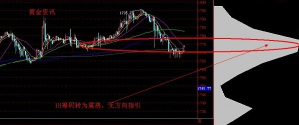 1H图形。移动筹码昨日变化较大,早盘的支撑跟压力都消失了,筹码在1H处形成震荡趋势,谨慎者观望。