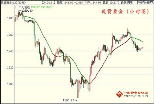 昨日黄金如期下挫,黄金价格日线图呈现一根略带上影线的阴线,行情仍具备下跌动能,预计日内可继续看低一线。从分时图来看,黄金价格凌晨于1240一线低位震荡整固,短线大有震荡筑底之势,预计欧亚盘有望迎来小幅反弹之势。