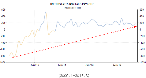2011年-2013年,美国的非农数据稍显回落,但增长稳定。一直维持在20万左右,大体上非农就业数据呈现逐渐走高趋势,利好美元,利空黄金。所以除非后面非农数据出现戏剧性变化,比如数据剧烈下降,否则美联储缩减QE的预期不会改变,国际现货金反弹的高度有限。