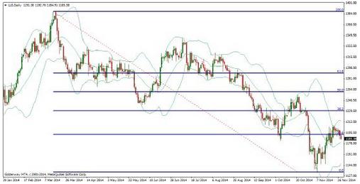 金鼎黄金网11月28日讯,昨日黄金价格日内整体纵向波幅为15美金,黄金价格最终报收于1191.98一线。K线形态呈现略带下引线的寸头阴柱。