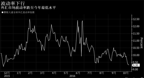 外汇市场波动率跌至今年最低水平,因投资者揣测市场已经充分消化了美国未来几个月加息的可能性,并且民意调查显示,随着美国大选日的临近,希拉里扩大对特朗普的领先优势。