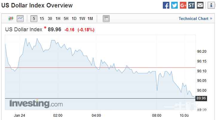 截至北京时间10:46,欧元兑美元报1.2315,上涨17点,上周曾触及三年高位1.2323;美元指数报89.96,下挫0.18%,为2014年12月31日以来首次跌破90大关。