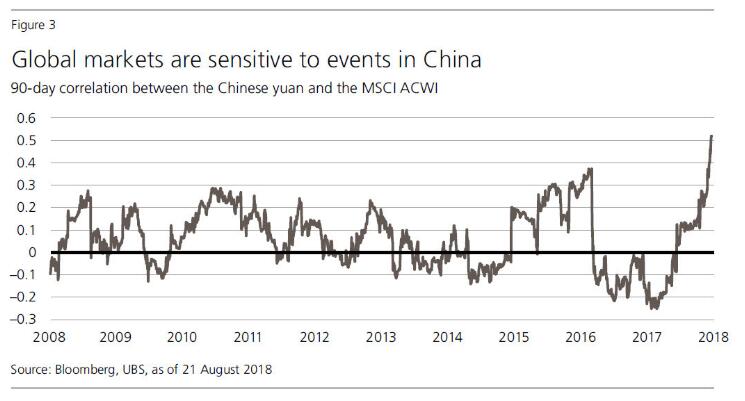 据瑞银财富管理(UBS Wealth Management)首席投资长Mark Haefele称,过去三个月,人民币与MSCI明晟所有国家全球指数(MSCI All Country World Index)的关联度达到至少10年来的最高水平。如果这种关系保持不变,人民币走稳会对全球股市形成支撑。