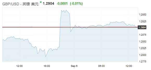英镑兑美元基本持平于1.2904美元,相较隔夜高点稍有回落,上日上涨0.4%。