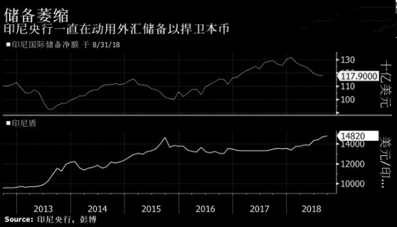 在新兴市场陷入动荡之际,为提振本币汇率,印尼央行今年已经动用了近10%的外汇储备,居亚洲大型经济体首位。菲律宾的储备减少了近5%,而印度的储备下降超过2%。