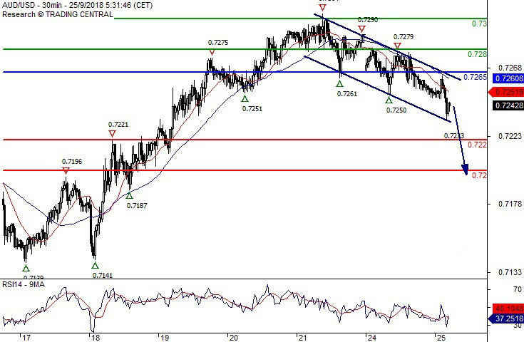 理由:只要澳元受限于0.7265阻力位下方,则将维持震荡下行偏好。