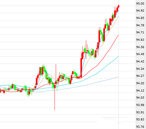 美市尾盘,美元指数延续稍早涨势,一举突破95关口,高见95.02。