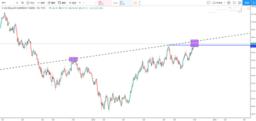 从美元指数日线图看,美元上方最新的压力位置在97.50附近,该位置也是日线级别的一根颈线位置,预计多空双方在这里还有争夺,另外最近关注美元指数的日线收盘价格,观察是否出现突破信号。