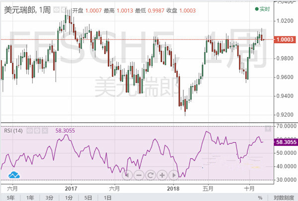 周一(11月19日)亚市午后,美元/瑞郎位于1.0005附近水平徘徊。上一交易日汇价自1.0128高点一路震荡下挫,连续5个交易日以阴线收跌,本交易日进一步延伸跌势至0.9986,目前自低位略微反弹,勉强站上1.0关口。