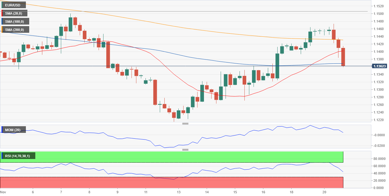 欧元兑美元跌破11月跌势的61.8%回档位,过去数日的上行动能丧失。4小时图显示,汇价目前挣扎于持平的100SMA附近,位于近期跌势的50%回档位上方附近,技术指标继续自超买回撤,进入负区域。若突破1.1425将进一步反弹,不过目前有机会跌破1.1355指向1.1300/10区域。
