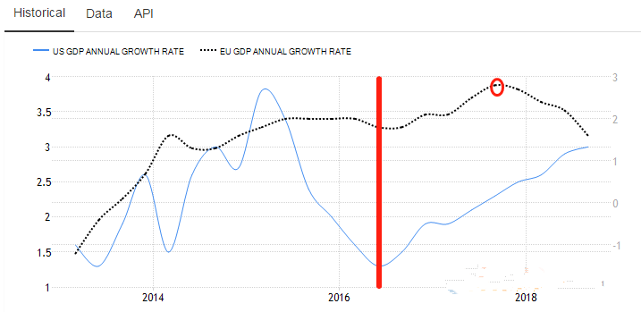 欧元区在2017年第三季度经济复苏达到顶峰,之后开启跌势,至今跌幅1.2%;美国GDP增速是在2017年第四季度触底之后,一路上冲,目前已经达到3%的纪录高位。两相比较,自然可以得出未来欧元兑美元出现较大幅度下跌的结论。但另外一个数据似乎并不支持这一论点。