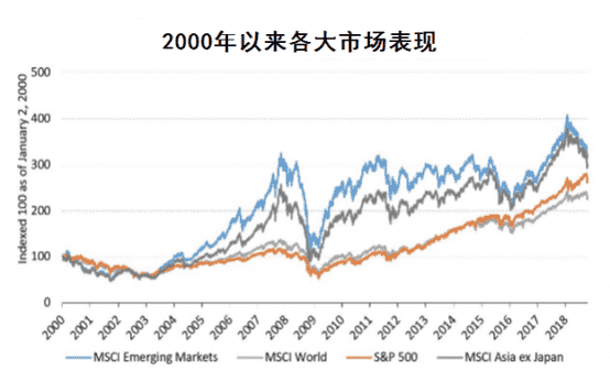 尽管过去05年表现不佳,但自本世纪初以来,新兴市场的表现优于包括美国市场在内的世界其他地区。