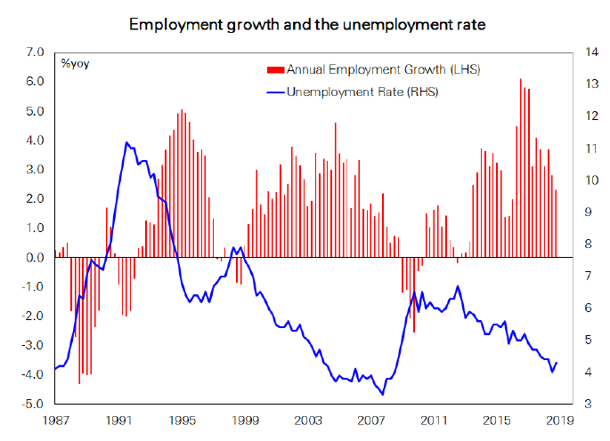 不过Odonaghoe也指出,这一变化并不意味着劳动力市场出现了根本性的趋势逆转,最多只能说2018年三季度的数据“过于完美”。正如上图所示,新西兰失业率趋势仍处于下降态势,而就业岗位和工资仍维持在正向增长,且高于2017年早些时候处于周期底部的数据。