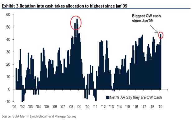随着投资人增加现金配比,超配现金的基金经理人触及2009年1月以来最高水准。上一次市场如此拥抱现金的时刻还是美股大底部完成之前的两个月,随后美股进入了9年牛市行情。