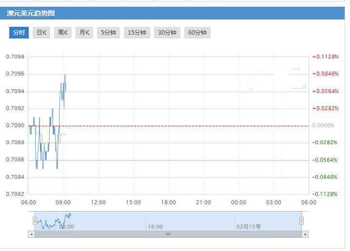 周四(2月14日)亚市盘中,澳元兑美元小幅整理于 0.7090附近,目前报价 0.7094,涨0.06%。