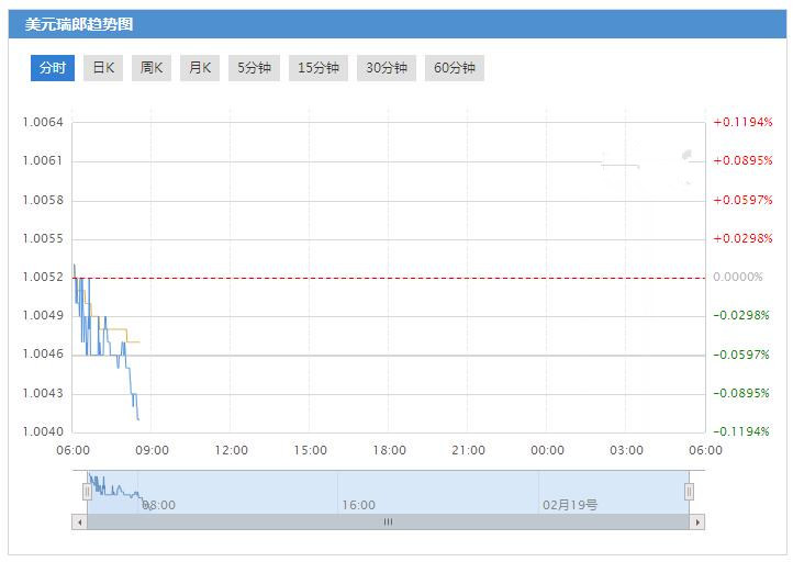 外汇网行情中心显示,北京时间8:33,美元兑瑞士法郎1.0041