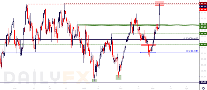 迄今为止美国并没有公布多少令人眼前一亮的数据,但美元指数仍然涨出新高。这很可能是受欧元走势的影响,因欧元/美元走低美元反走高。目前美元指数很快又来到了97.71这一重要的阻力水平附近,去年该水平曾两度充当上行阻力。