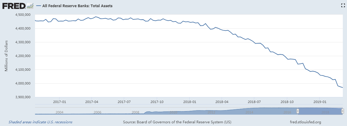市场已经不再预期美联储会在2019年加息,而今年1月的议息会议纪要也显示,美联储多数官员倾向于在年内结束缩减资产负债表的行动。2017年10月以来,美联储的资产负债表规模已经减少了近4900亿美元。