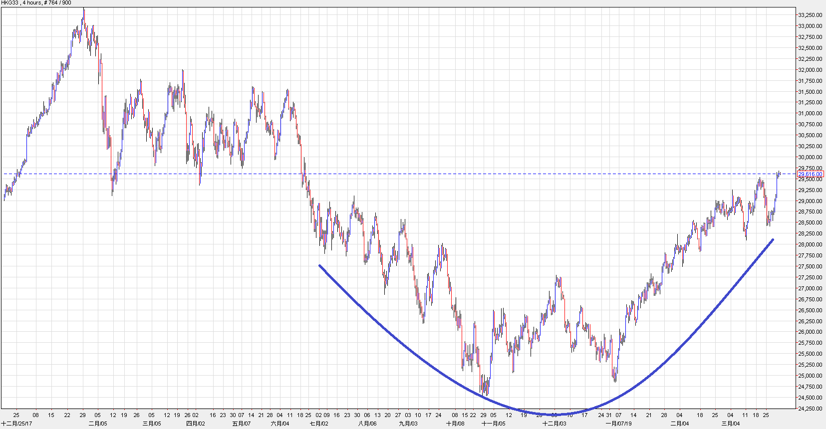 香港指数(恒生指数HKG33),四小时图呈圆形底,预示后市有很大上升空间,中线目标31000点,建议投资者候位买入。