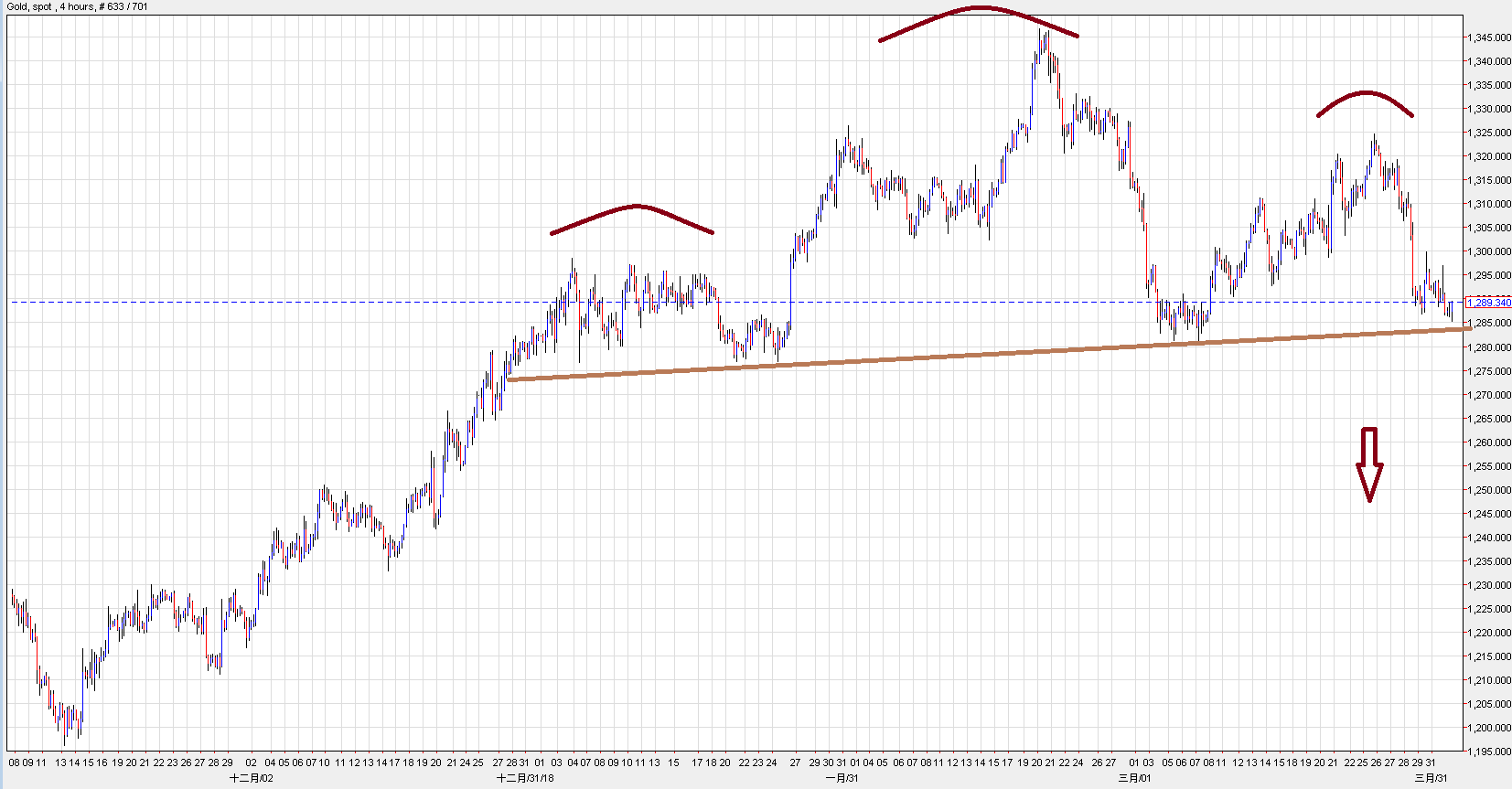 国际黄金四小时图呈头肩顶,短线向下调整机会大,后市目标1260美元。