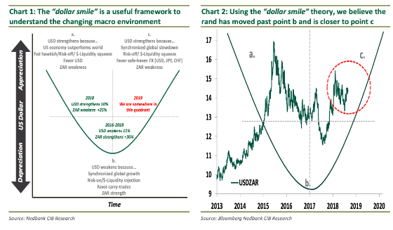 A阶段:“强劲的美国经济” 。美国经济增长强劲,表现优于世界其他地区,吸引资金流入美国。与此同时,美联储强硬的货币政策立场(通胀压力)也进一步支撑美元(2018年,美元上涨10%,南非兰特跌逾25%)。