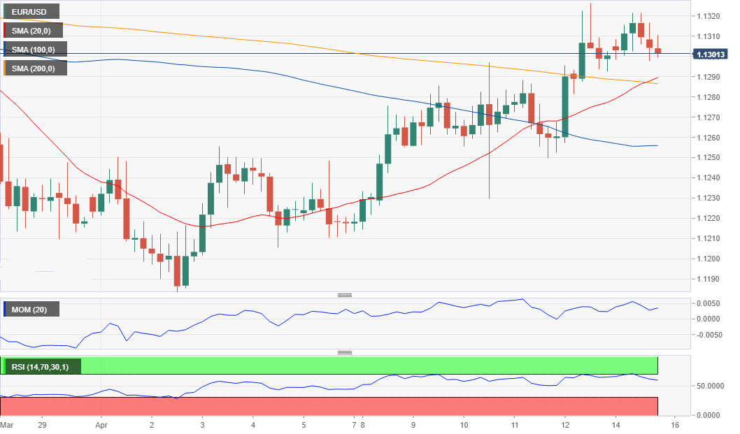 汇价位于斐波回档位之间,处于前一日区间顶部。表明多头占主导。4小时图汇价位于均线上方,20SMA延续涨势至100SMA上方,即将突破200SMA,通常是上涨信号。技术指标回落,位于正水平,若跌破1.1285将增加短线下修风险,若跌破1.1245则多头将放弃。