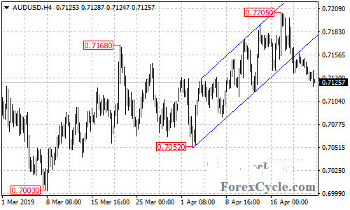 澳元延续自0.7205开始的下跌运动,一度触及低位0.7121水平。