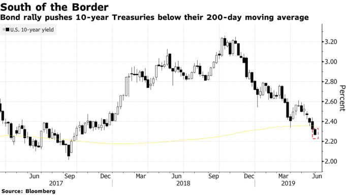 令人意外的关税举措扩大了美国国债近期的涨势,10年期国债收益率跌至200日移动均线下方,这是关键的技术水平。该收益率最新报2.18%,是自2017年9月的最低点。