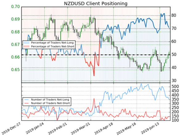 散户情绪报告显示,纽元/美元有近70.7%的头寸是净多头,多头和空头的持仓比为2.41:1。不过,净多头较上周减少31.0%,净空头较上周上涨7.3%。散户情绪报告通常作为反向指标,散户看多暗示纽元/美元可能下跌。近期的持仓变化情况或暗示纽元/美元自6月14日之后的涨势或很快被逆转。