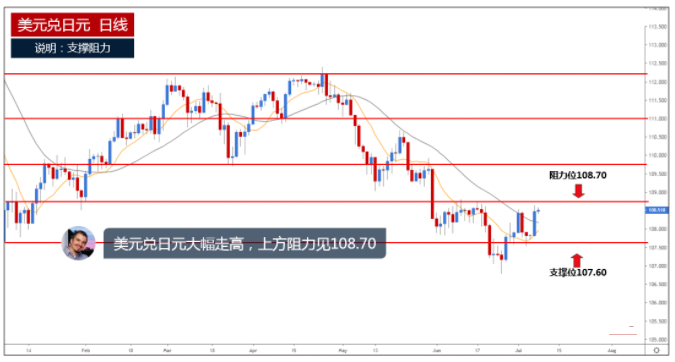 图为美元兑日元日线走势,价格快速走高,上方阻力见108.70.