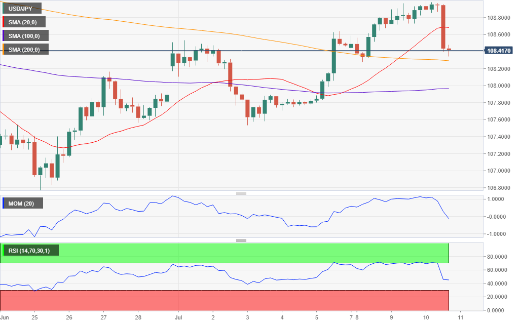 在美元/日元自日低108.34温和反弹,失去周初的积极动能,若汇价跌破日低汇价将进一步下跌。4小时图显示美元/日元在200SMA附近获得支撑,但仍处在20SMA下方,同时技术指标处在消极区域,动能指标朝南,相对强弱指标持平于47附近。若美元/日元突破108.70,汇价将进一步下行,但这取决于美债收益率的波动。