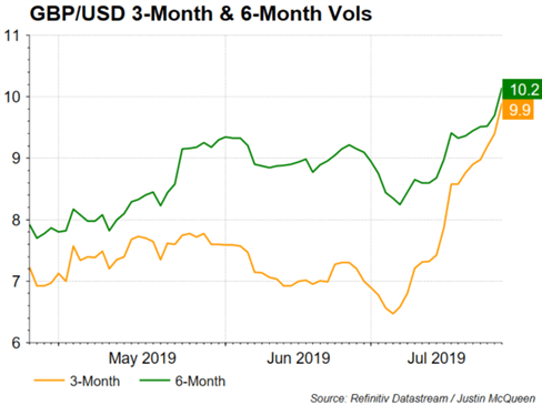 此外,英镑/美元最近几周的3个月隐含波动率与6个月隐含波动率的差距正在缩小,因市场开始对10月31日截止日期之前英国退欧的风险定价。换而言之,越临近截止日期英镑的波动越大。不过,该隐含波动率仍未达到前一个截止日期前的峰值。 因此,预计3个月隐含波动率将继续走高。