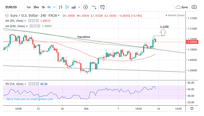 周一(10月14日)报道,日内欧元/美元回测1.10上方区域。