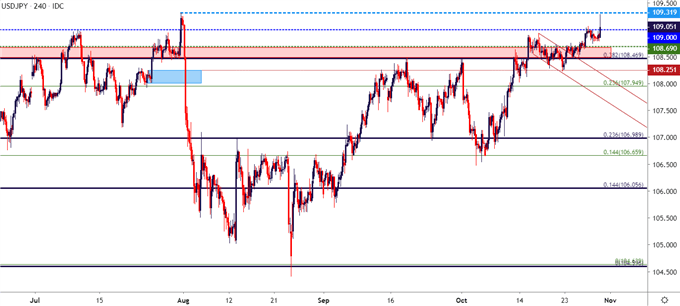 在美联储新闻发布会美元走强期间,欧元/美元空头出手开始推低汇价,但随后很快在1.1082(6月-10月整体跌势的38.2%斐波回撤水平)附近寻得支撑。上周欧元/美元持续录得了一系列更低的高点,倘若汇价跌破上述支撑则将为后市看跌敞开大门,进一步潜在的关键支撑将关注1.1000水平附近。