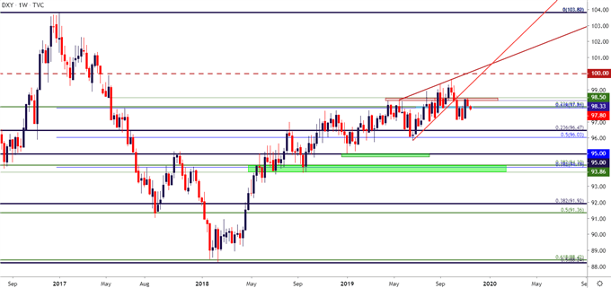 从周线图表上看,看跌主题变得更加有趣。 今年到目前为止,美元整体倾向于走高,今年的第一周价格就在95.00获得了支撑测试。然而,多头并没有因此变得振奋,每一次的走高都伴随着回调,这导致图表上最终形成一个上升楔形形态,该形态通常意味着看跌反转。10月份美联储第三次降息的时候价格开始跌破楔形形态的下轨,然而11月初的反弹表明空头尚未掌控主导权。