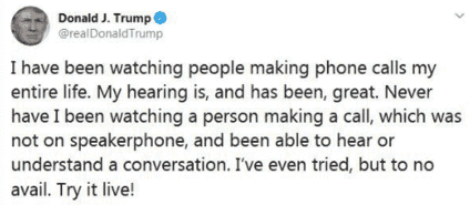 特朗普连续针对弹劾调查听证会表态,他称这辈子做梦都没想到,自己会跟弹劾这个肮脏的词联系到一起。他强烈表示,电话记录是完美的,没有错误,自己对乌克兰没有施压。