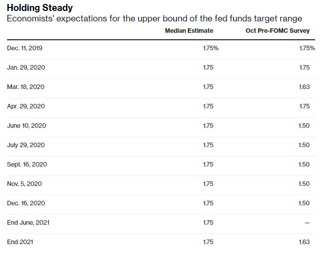在12月2-4日对29位经济学家进行的调查中,受访者放弃了他们之前的关于2020年降息的预期。预测中值表明,预计到2021年底,联邦基金利率的目标区间将保持在1.5%-1.75%的水平。