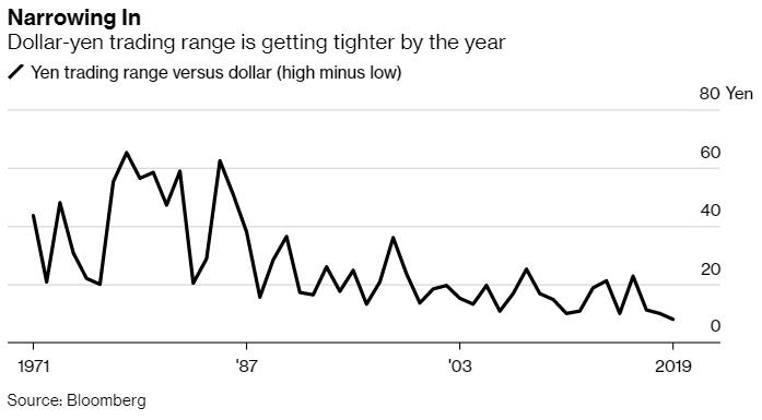 对于日元交易员而言,即将过去的这个2019年,无疑是半个世纪以来行情最为平淡的一年!美元兑日元汇率自1月份以来的波动幅度始终低于8日元,至少是50年来数据中的最低水平。