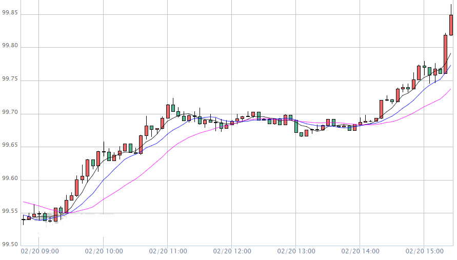 北京时间周四(2月20日)欧市盘中,美元指数小幅冲高,刷新2017年5月12日以来高点至99.86,涨幅约0.15%,非美货币普遍走弱,且之前美联储会议纪要显示美联储官员对经济持乐观态度;英镑兑美元创八个交易日新低至1.2890,日内跌幅扩大到0.24%;美元兑日元创九个多月新高至111.72,涨幅扩大到0.31%;美元兑瑞郎创两个多月新高至0.9848,涨幅扩大到0.07%。