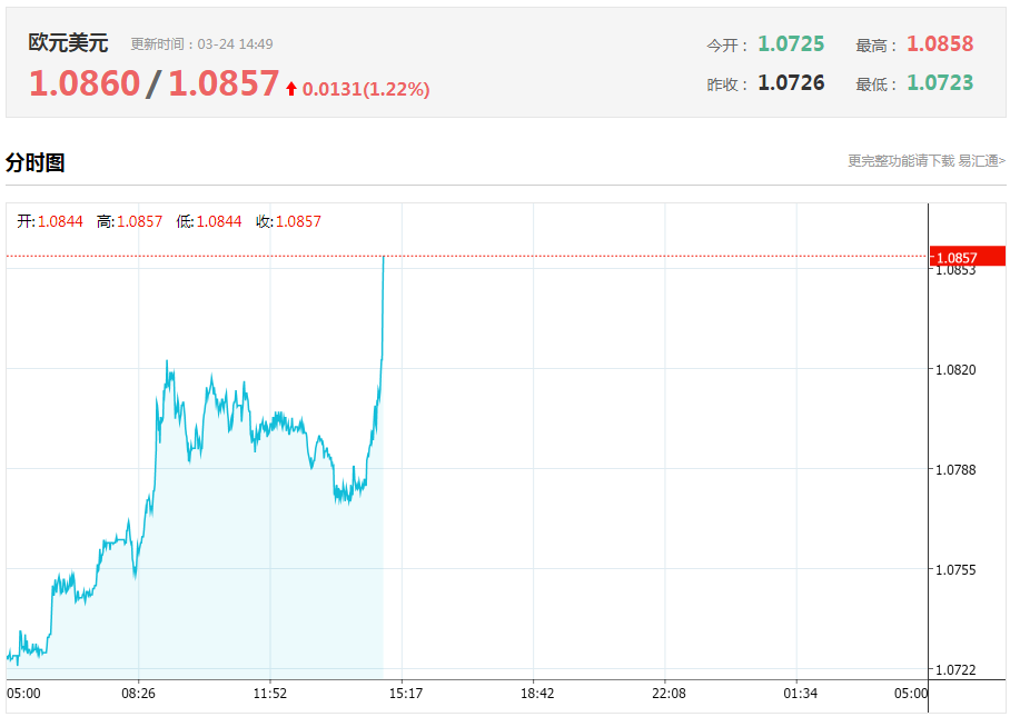 周二(3月24日)亚太午盘,美元指数DXY短线走低逾30点至101.33;非美货币快速拉升,英镑兑美元GBP/USD短线涨近40点至1.1697,日内涨幅扩大至逾2%,澳元兑美元AUD/USD涨幅扩大至2.5%,报0.5978,欧元兑美元EUR/USD涨1.25%,报1.0852。
