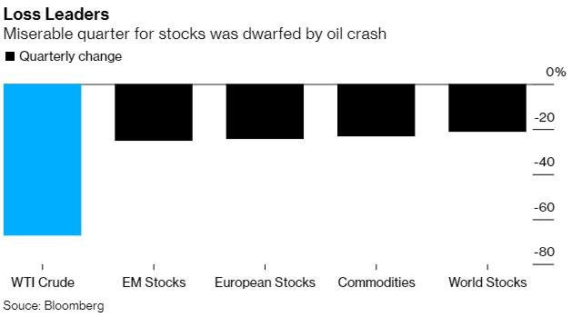 而就跌幅而言,最大的输家毫无争议地是原油。美国原油和布伦特原油整个3月都因新冠病毒疫情导致全球经济停摆,以及俄罗斯和沙特之间的价格战而遭受重创。两大指标原油本季均下跌约三分之二,为有史以来最糟糕的季度,其中大部分跌幅在3月录得,3月油价下跌约55%。