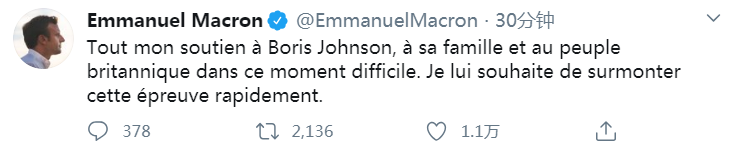 在得知这一消息后,法国总统马克龙发表推文,力挺约翰逊。他用法语写道,“在这困难时刻,我全力支持约翰逊、他的家人和英国人民。我希望他能尽快克服这一磨难。”