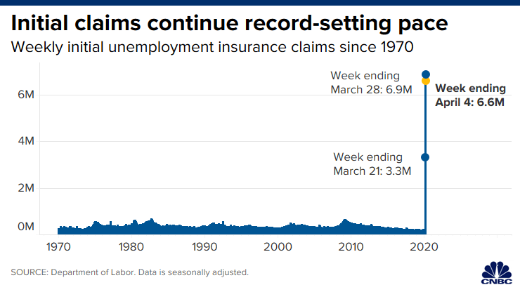 过去三周,美国申请失业救济金的人数已超过1500万。而截至4月4日当周初请失业金人数约为660万人,较前一周上修后的687万人略有下降,但仍连续两周录得超过600万人,因美国依然采取严格的防控措施导致经济陷入停滞。