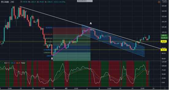 但需要留意的是,日内一旦涨破隔夜高点100.30水平,则KDJ指标将顶背离,不排除引发短线较强的回撤修正风险。