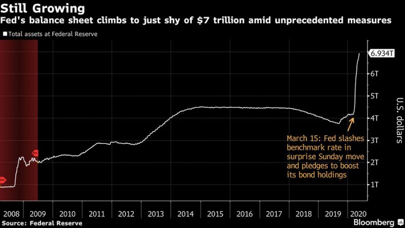 美联储为将美国经济从冠状病毒影响中拯救出来而采取的史无前例措施,正使其资产负债表规模再创新高——本周,美联储资产负债表上的债券和其他资产增至近7万亿美元!