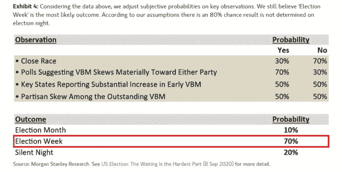 相比之下,摩根士丹利最新公布的数据都算乐观了。大摩指出,大选夜无法当即定下推举成果的可能性有80%,但终究成果的承认应该不必一个月那么久,估计有70%的可能在一周内出成果。而最糟糕的状况——一个月才干出成果呈现的可能性仅为10%。