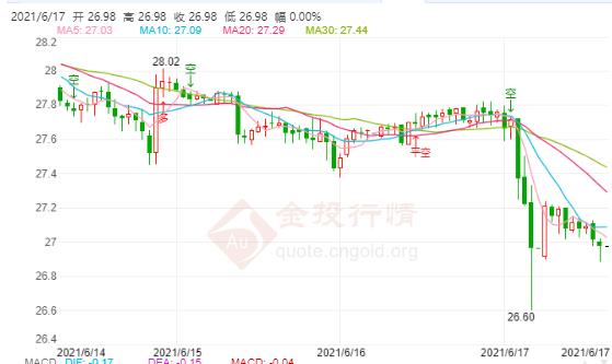 原标题:美联储鹰派不及预期 国际白银延续震荡周三(6月16日)本交易日国际白银开盘报27 64美元 盎司,最高触及27 70美元 盎司,最低触及27 57美元